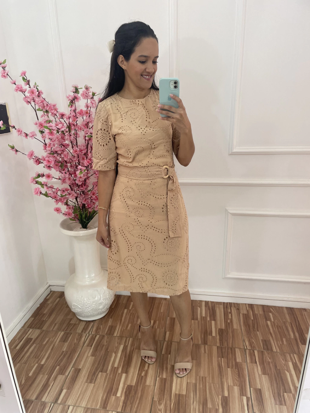 O vestido Emma de lese possui um corte evasê na saia, proporcionando uma silhueta fluida e feminina. O decote arredondado adiciona simplicidade a peça. O zíper nas costas facilita vestir proporcionando praticidade ao ajuste da peça. Acompanha faixa com detalhe na ponta para ajustar a cintura.Uma peça elegante, que se combinando com elementos clássicos e contemporâneos se encaixa em diversas ocasiões.